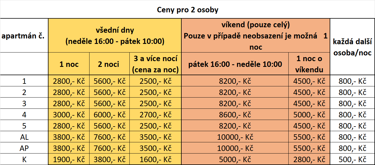 - Zvýhodňujeme pobyty na 3 a více nocí. Cena za 1 noc se ponižuje jenom za všední dny. Cena za víkend se neponižuje