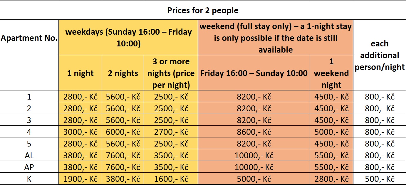 - Weekend voucher (Fri 4 PM – Sun 10 AM): from 8,200 CZK / 2 guests